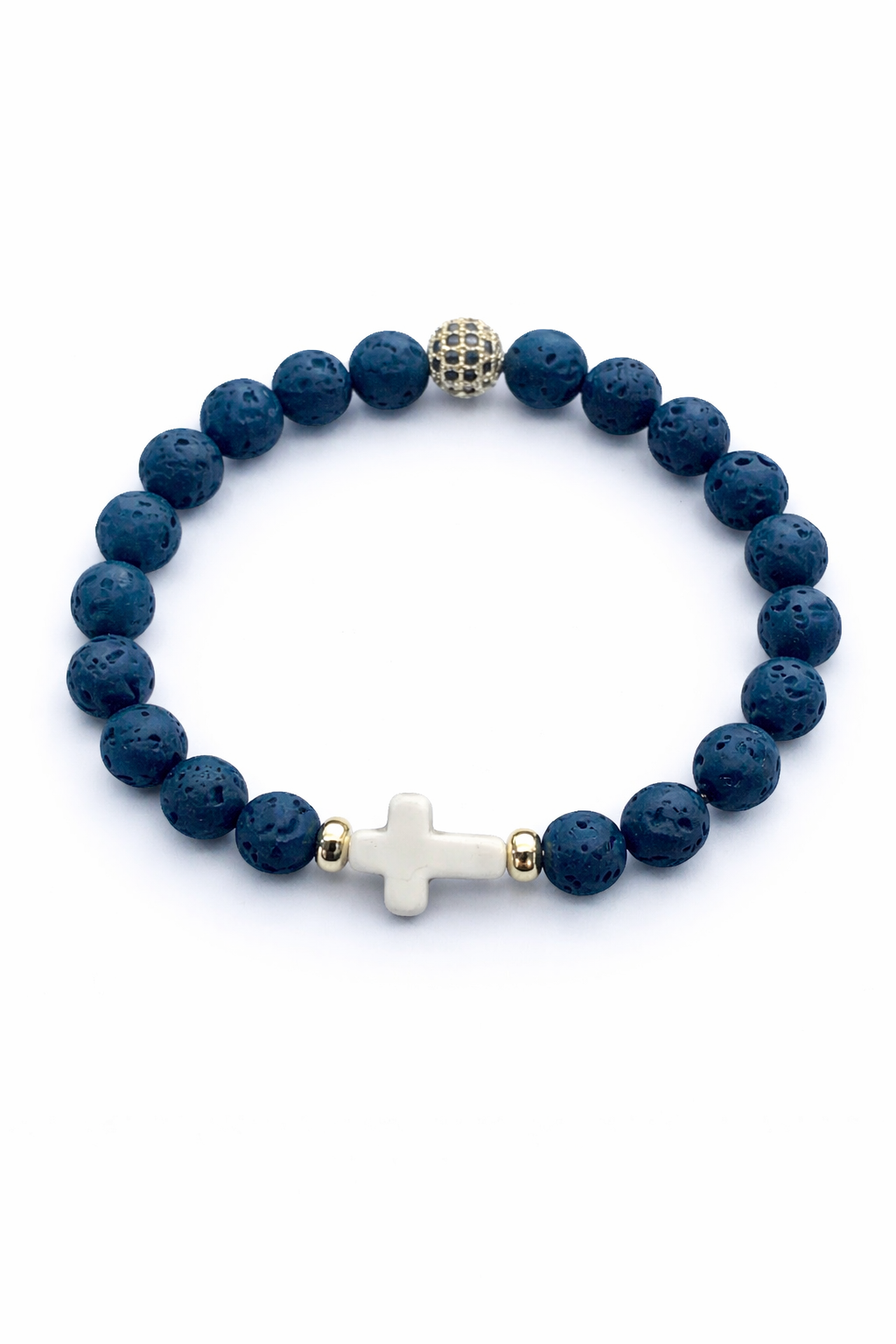 Stoere mannenarmband met lavastenen kralen met howliet kruis.