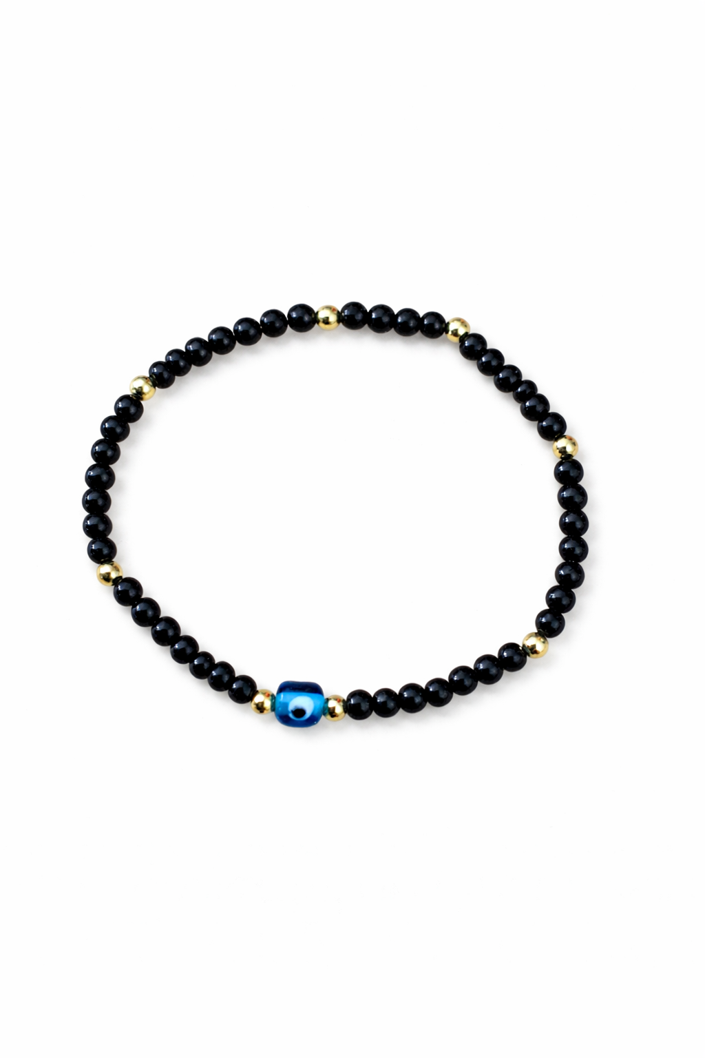 Een stijlvolle en betekenisvolle armband met diepe zwarte onyx kralen, gecombineerd met verfijnde goldfilled details en een subtiele evil eye kraal.