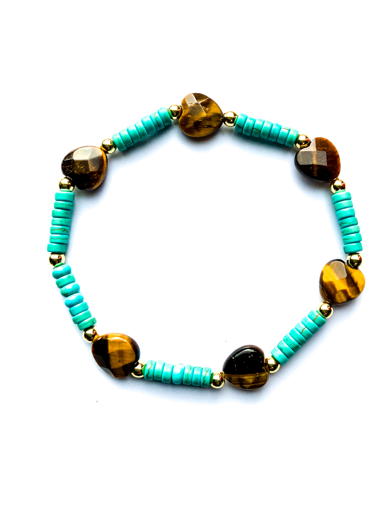 Turquoise Treasure is een elegant en handgemaakt sieraad dat natuurlijke schoonheid en tijdloze stijl combineert. De armband bestaat uit warme hartjes van tijgeroog, sprankelende goldfilled kralen en levendige turquoise howliet, een steen die bekendstaat om haar kalmerende en beschermende eigenschappen.